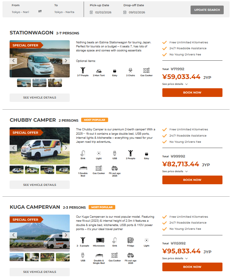 Campervan Japan では、旅の人数やスタイルに合わせて、複数の車種が用意されています。